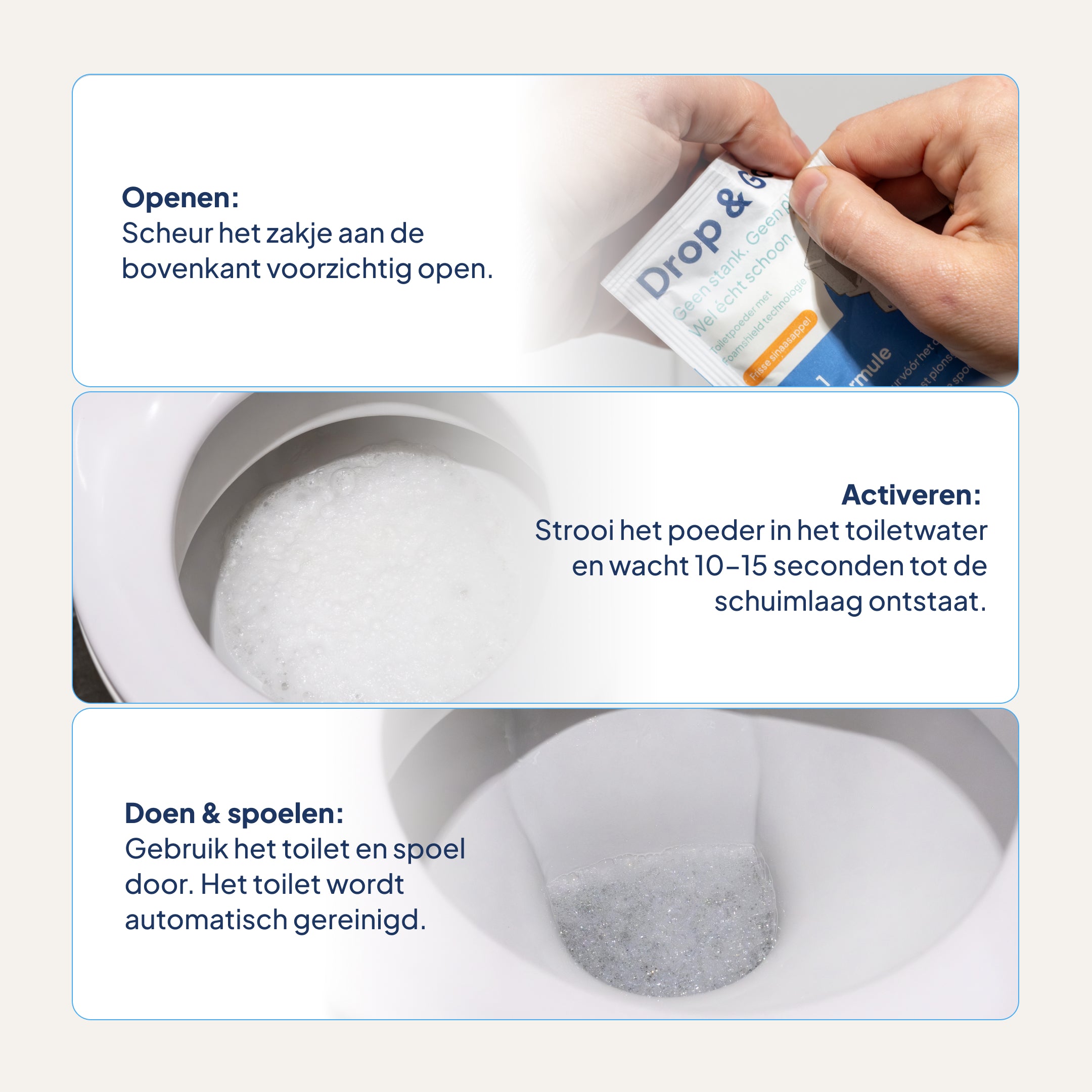Zodra het poeder het water raakt, ontstaat een actieve schuimlaag die geuren direct insluit en neutraliseert. Geen twijfel meer. Alleen frisheid.